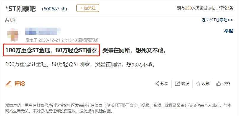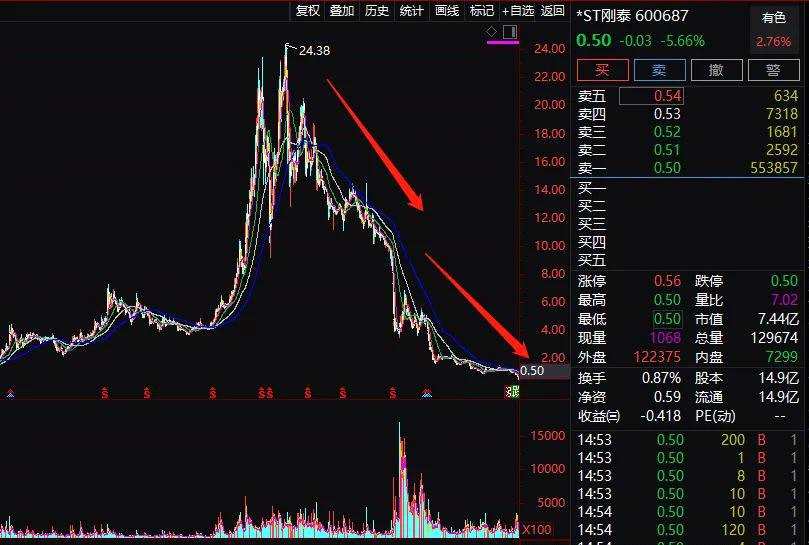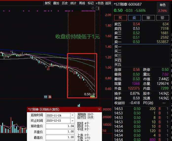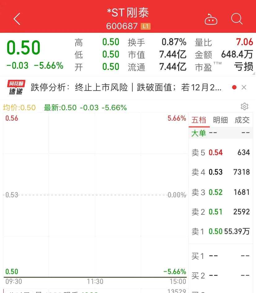 12月21日,*ST金鈺提前鎖定面值退市(詳細(xì)報(bào)道見6萬股民懵了!剛剛,突然閃崩跌停,這只股鐵定退市!暴跌96%,260億灰飛煙滅!昔日云南首富“涼了”),而【*ST剛泰(600687)、股吧】則是妥妥的走完了20個交易日收盤價低于1元面值,觸發(fā)退市。*ST剛泰當(dāng)天死死的以0.5元的價格一字跌停,走完觸發(fā)退市最后一天。