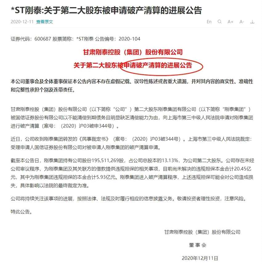 12月11日,還發(fā)布了二股東剛泰集團(tuán)破產(chǎn)重整進(jìn)展公告。
