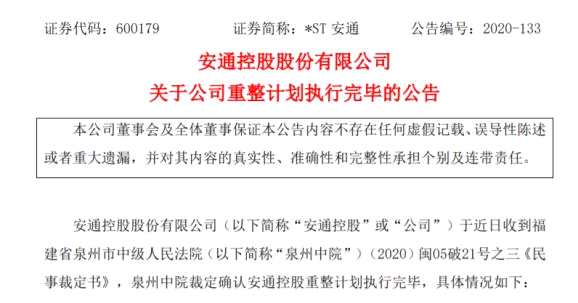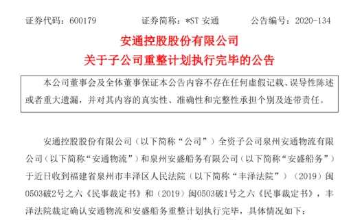 在公告中,*ST安通還表示,公司進入重整程序后,通過在重整程序中實施出資人權(quán)益調(diào)整,引入實力雄厚的重整投資人提供資金支持,最大限度保障了全體債權(quán)人合法權(quán)益,化解了公司債務(wù)危機,改善了公司資產(chǎn)負債結(jié)構(gòu)。本次重整計劃執(zhí)行完成后,隨著債務(wù)危機的化解以及重整產(chǎn)業(yè)投資人對公司業(yè)務(wù)發(fā)展的支持,公司將逐步恢復持續(xù)經(jīng)營能力和盈利能力,重回良性發(fā)展軌道,這也將對公司2020年度凈資產(chǎn)和凈利潤產(chǎn)生積極影響。