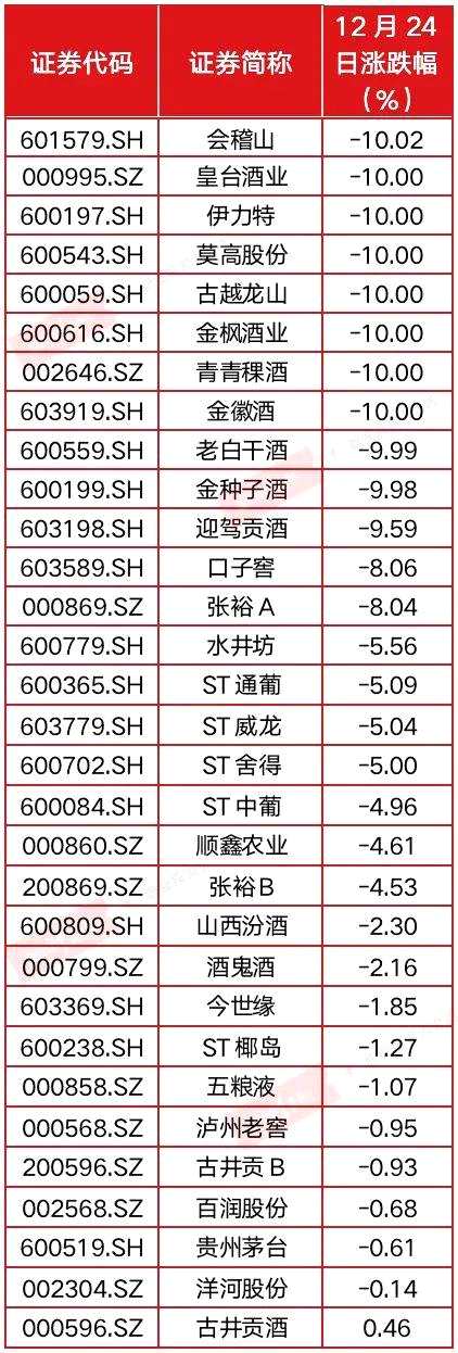 附表 12月24日白酒行業(yè)股價(jià)漲跌幅一覽