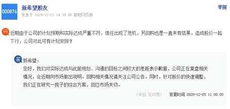 另外,很多投資者質(zhì)疑新希望存在瞞報(bào)、遲報(bào)經(jīng)營(yíng)狀況的行為。其中一位投資者表示“養(yǎng)豬行業(yè)充滿(mǎn)變數(shù),大家都很理解,但是像豬育肥要幾個(gè)多月的時(shí)間,實(shí)際上公司應(yīng)該較早就知道一些數(shù)據(jù)發(fā)生了變化,應(yīng)該及時(shí)與市場(chǎng)溝通”。