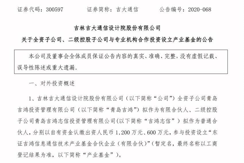 2020年12月23日,由吉林【吉大通信(300597)、股吧】(300597)設(shè)計院股份有限公司(以下簡稱“吉大通信”)全資子公司青島吉鴻投資管理有限公司(以下簡稱“青島吉鴻”)及二級控股子公司青島吉鴻志信投資管理有限公司(以下簡稱“吉鴻志信”)參與投資設(shè)立的產(chǎn)業(yè)基金“東證吉鴻信息通信技術(shù)產(chǎn)業(yè)基金合伙企業(yè)(有限合伙)”(以下簡稱“產(chǎn)業(yè)基金”),正式簽署合伙協(xié)議。
