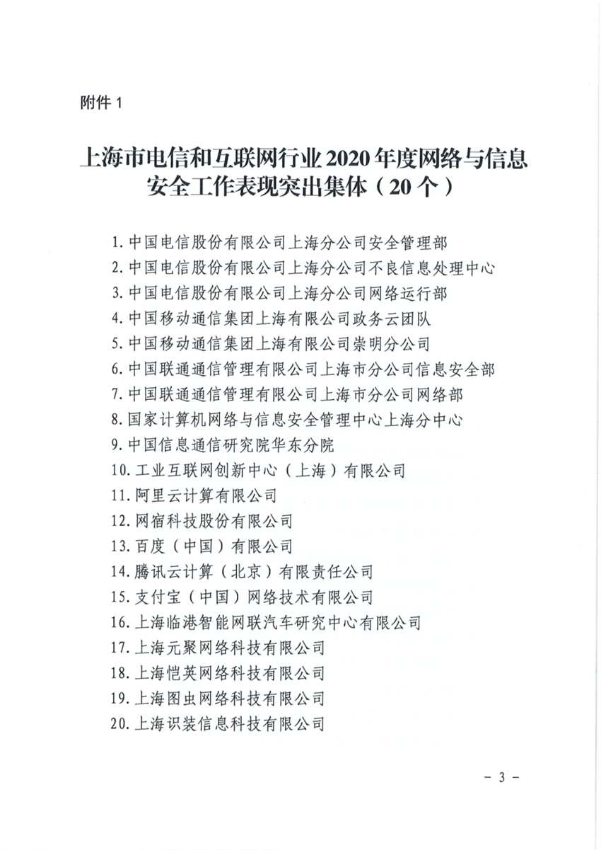 2020年,在工業(yè)和信息化部與上海市委市政府的堅強領(lǐng)導(dǎo)和統(tǒng)一部署下,在全球新冠肺炎疫情蔓延這一特殊背景下,在各單位廣大干部職工的共同努力下,上海市電信和互聯(lián)網(wǎng)行業(yè)圓滿完成了“疫情防控網(wǎng)絡(luò)信息安全保障”、“第三屆進口博覽會網(wǎng)絡(luò)信息安全保障”等各項網(wǎng)絡(luò)與信息安全重大保障任務(wù),出色開展了本年度各類網(wǎng)絡(luò)與信息安全工作,并涌現(xiàn)出一批愛崗敬業(yè)、表現(xiàn)突出、成績顯著的集體和個人,得到工業(yè)和信息化部以及上海市委、市政府的充分肯定和贊揚。