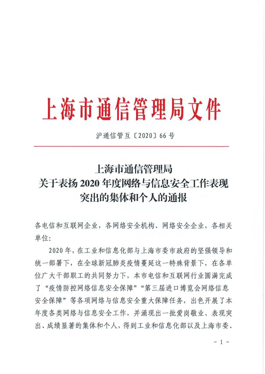 摘要: 近日,上海市通信管理局就2020年度網(wǎng)絡(luò)與信息安全工作表現(xiàn)突出的集體和個人進行了通報表揚。