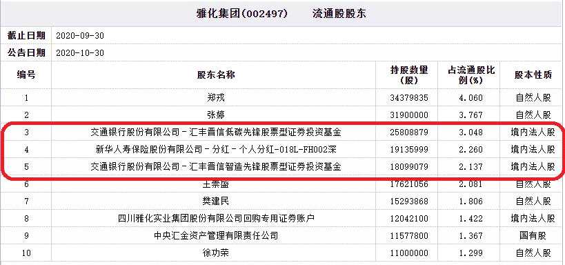 雅化集團(tuán)前十大流通股東中,交通銀行股份有限公司-匯豐晉信低碳先鋒股票型證券投資基金持有2580.89萬(wàn)股,持股比例為3.048%,為第三大流通股東;新華人壽保險(xiǎn)股份有限公司-分紅-個(gè)人分紅-018L-FH002深持有1913.60萬(wàn)股,持股比例為2.260%,為第四大流通股東;交通銀行股份有限公司-匯豐晉信智造先鋒股票型證券投資基金持有1809.91萬(wàn)股,持股比例為2.137%,為第五大流通股東。