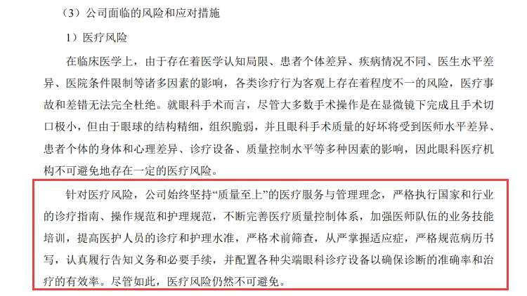 愛爾眼科在風險應對措施中第一條就特別強調(diào),“嚴格執(zhí)行國家和行業(yè)的診療指南、操作規(guī)范和護理規(guī)范,不斷完善醫(yī)療質(zhì)量控制體系,加強醫(yī)師隊伍的業(yè)務技能培訓,提高醫(yī)護人員的診療和護理水準,嚴格術前篩查,從嚴掌握適應癥,嚴格規(guī)范病歷書寫,認真履行告知義務和必要手續(xù),并配置各種尖端眼科診療設備以確保診斷的準確率和治療的有效率” 。