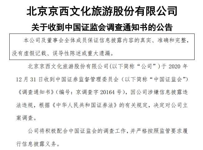 2021年1月4日,北京京西文化旅游股份有限公司(證券代碼:000802,證券簡稱:北京文化(000802))發(fā)布《關于收到中國證監(jiān)會調(diào)查通知書的公告》,因公司涉嫌信息披露違法違規(guī),根據(jù)《證券法》的有關規(guī)定,中國證監(jiān)會決定對公司立案調(diào)查。