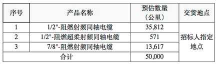 本次集采擬采購三類同軸電纜產(chǎn)品,包括阻燃射頻同軸電纜、阻燃超柔射頻同軸電纜、阻燃射頻同軸電纜,總規(guī)模為5萬公里。具體如下:
