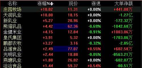 摘要: 1月6日,乳業(yè)概念繼續(xù)走強(qiáng),莊園牧場(chǎng)(002910)、天潤(rùn)乳業(yè)(600419)封板領(lǐng)漲,新乳業(yè)(002946)、熊貓乳品(300898)、金健米業(yè)(600127)等紛紛跟漲,漲超4%。