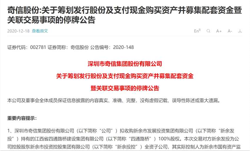 股價(jià)閃崩后,公司便緊急停牌。12月17日晚間,奇信股份發(fā)布《關(guān)于籌劃發(fā)行股份及支付現(xiàn)金購(gòu)買資產(chǎn)并募集配套資金暨關(guān)聯(lián)交易事項(xiàng)的停牌公告》。公告顯示,奇信股份擬收購(gòu)新余市發(fā)展投資集團(tuán)有限公司持有的江西省四通路橋建設(shè)(600263)集團(tuán)有限公司100%股權(quán),此次交易預(yù)計(jì)構(gòu)成《上市公司重大資產(chǎn)重組管理辦法》規(guī)定的重大資產(chǎn)重組情形,于12月18日起停牌,預(yù)計(jì)停牌時(shí)間不超過(guò)10個(gè)交易日。