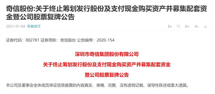 然而,重組也是說(shuō)終止就終止。1月3日晚間,奇信股份發(fā)布《奇信股份:關(guān)于終止籌劃發(fā)行股份及支付現(xiàn)金購(gòu)買資產(chǎn)并募集配套資金暨公司股票復(fù)牌公告》。
