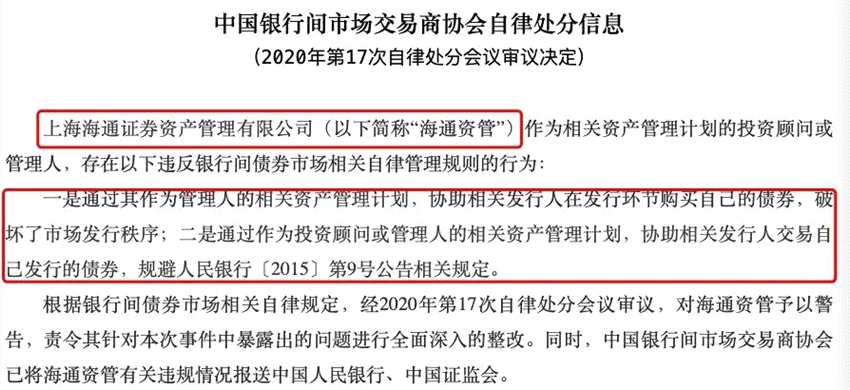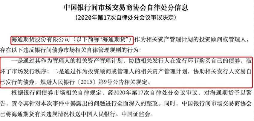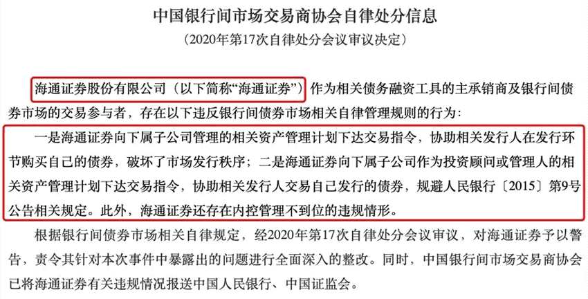 根據(jù)銀行間債券市場相關(guān)自律規(guī)定,經(jīng)2020年第17次自律處分會議審議,對海通證券予以警告,責(zé)令其針對本次事件中暴露出的問題進(jìn)行全面深入的整改。同時,中國銀行間市場交易商協(xié)會已將海通證券有關(guān)違規(guī)情況報送中國人民銀行、中國證監(jiān)會。