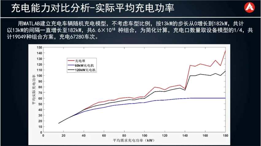 與傳統(tǒng)的充電設(shè)備相比,充電堆的最大優(yōu)勢在于利用率。我們通過MATLAB建立了一個(gè)仿真模型,在相同的裝機(jī)功率、車位數(shù)量、配電容量等條件下,通過改變同時(shí)充電的車輛數(shù)量和不同車輛的實(shí)際需求功率,來進(jìn)行對比分析。如果實(shí)際需求功率按13kW的步長從0增長到182kW,16個(gè)充電車位的實(shí)際需求功率組合情況將高達(dá)6.6×1018種,為了進(jìn)一步簡化計(jì)算,將充電車位數(shù)量縮減為4個(gè),實(shí)際需求功率組合數(shù)量將縮減為19049種,充電67280車次。仿真的結(jié)果如下面的曲線所示。