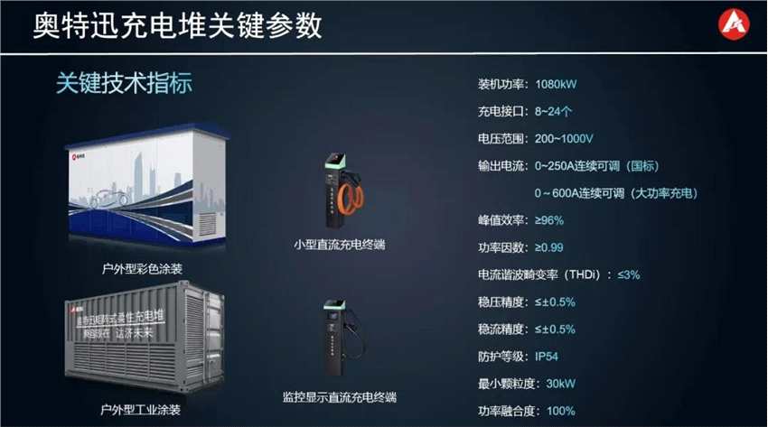 下面展示的是奧特迅標(biāo)準(zhǔn)充電堆的關(guān)鍵參數(shù)。奧特迅建設(shè)的標(biāo)準(zhǔn)充電堆容量為1080kW,充電接口數(shù)量為8~24個(gè),前兩年的直流輸出電壓范圍為200~950V,從今年開始,所有新建充電站的直流輸出電壓范圍均為200~1000V。充電終端的輸出電流分為兩檔:常規(guī)GB2015版充電槍為250A,大功率充電槍為600A。充電堆有兩種結(jié)構(gòu)形式,一種是集裝箱式,還有一種是微模塊式。隨充電堆配置的充電終端尺寸特別小,十分便于利用車位后部有限的空間安裝。