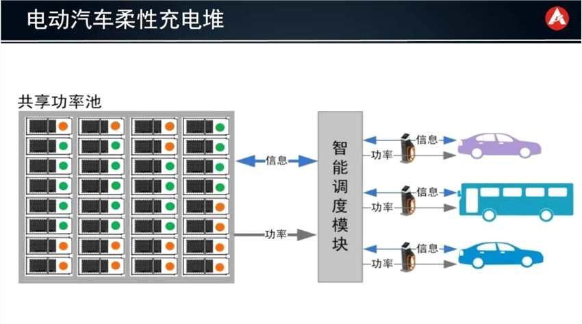電動汽車柔性充電堆的簡單原理,把功率模塊整合在一起,集中進(jìn)行控制與調(diào)度。充電堆最核心的技術(shù)特點(diǎn),就是功率融合+動態(tài)分配。圖中左上角展示的就是共享功率池,紅色代表已經(jīng)利用部分,黃色是還沒有利用的部分,通過共享功率,充電模塊的利用率可以達(dá)到最佳的實(shí)用效果。