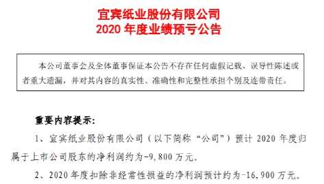 1月12日盤后,宜賓紙業(yè)發(fā)布2020年度業(yè)績預(yù)虧公告稱,預(yù)計2020年度歸屬于上市公司股東的凈利潤約為-9800 萬元,而上年同期為1235.29萬元,同比減少11035.29萬元;2020年度扣除非經(jīng)常性損益的凈利潤預(yù)計約為6900 萬元,而上年同期為-9020.54萬元,同比增加虧損7879.46萬元,增虧幅度為87.35%。