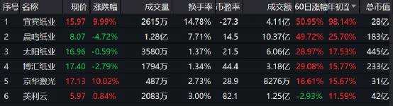 而除了現(xiàn)貨市場,紙類相關(guān)的股票、期貨標(biāo)的近期也出現(xiàn)異動。A股方面,數(shù)據(jù)顯示,造紙指數(shù)今年以來漲幅達(dá)到10.01%,24只成分股中,16只飄紅。除宜賓紙業(yè)外,晨鳴紙業(yè)漲超25%,太陽紙業(yè)、博匯紙業(yè)(600966)、【京華激光(603607)、股吧】(603607)、美利云(000815)漲超10%。