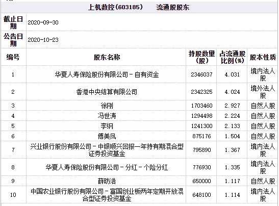 截止2020年9月30日,華夏人壽保險股份有限公司-自有資金與華夏人壽保險股份有限公司-分紅-個險分紅分別持有上機數(shù)控234.60萬股、77.69萬股,占流通股比例分別為4.031%、1.335%,為其第一、第八大流通股股東。