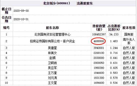 據(jù)公告顯示,截止2020年9月30日,招商證券國(guó)際有限公司-客戶資金持有北京城鄉(xiāng)469.89萬(wàn)股,占流通股比例為1.483%,是其第二大流通股股東。