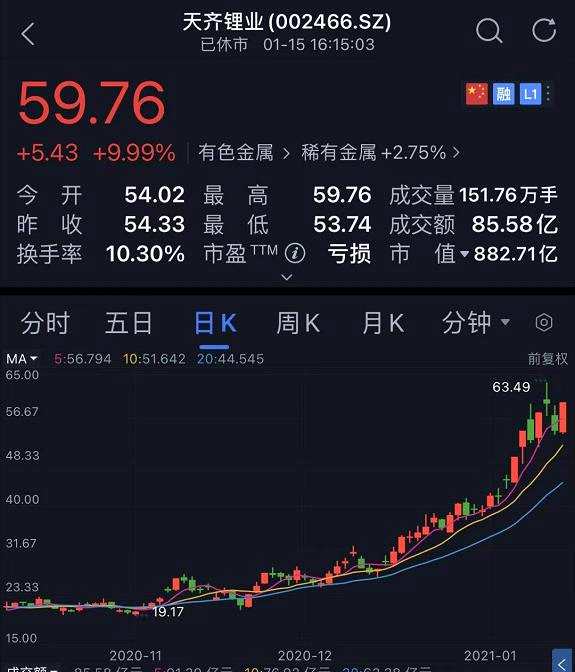 受益于新能源汽車產(chǎn)業(yè)鏈的全面景氣,又在此利好消息刺激下,天齊鋰業(yè)股價近期強(qiáng)勢反彈,最新數(shù)據(jù)顯示,周五該股漲停,報收59.76元,成交85.58億元,最新市值高達(dá)882.7億元。此前一個月時間,天齊鋰業(yè)股價啟動上漲,截至今日累計漲幅超200%。