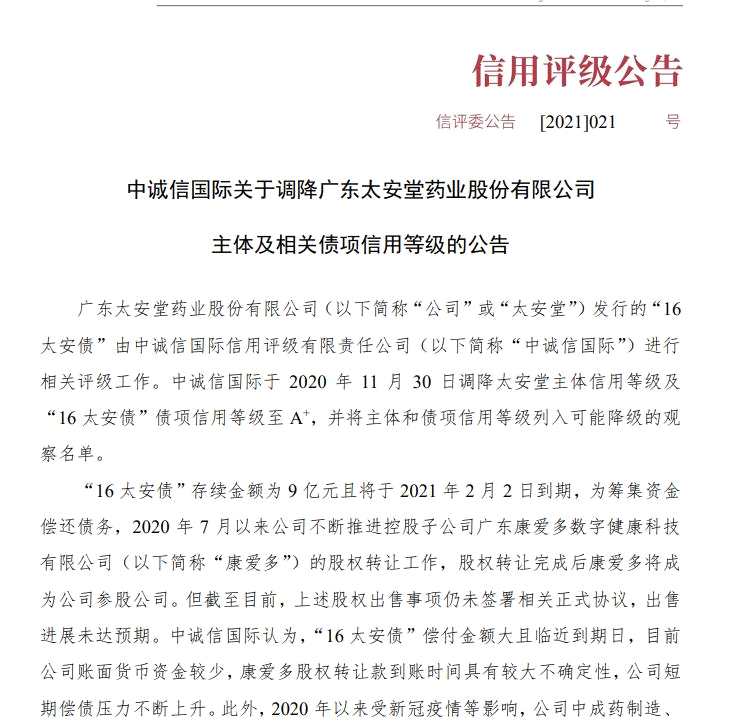 但5個(gè)月后,2020年11月30日,中誠(chéng)信國(guó)際開始調(diào)降太安堂信用等級(jí),公司的主體信用等級(jí)由AA調(diào)降至A+,“16太安債”的債項(xiàng)信用等級(jí)由AA調(diào)降至A+,主體和債項(xiàng)信用等級(jí)列入可能降級(jí)的觀察名單。