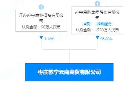 天眼查股權(quán)穿透圖顯示,目前,該公司由蘇寧易購(gòu)(002024)集團(tuán)股份有限公司和江蘇蘇寧商業(yè)投資有限公司共同持股,其中,蘇寧易購(gòu)集團(tuán)股份有限公司認(rèn)繳1550萬(wàn)人民幣,持有棗莊蘇寧云商96.88%股份。