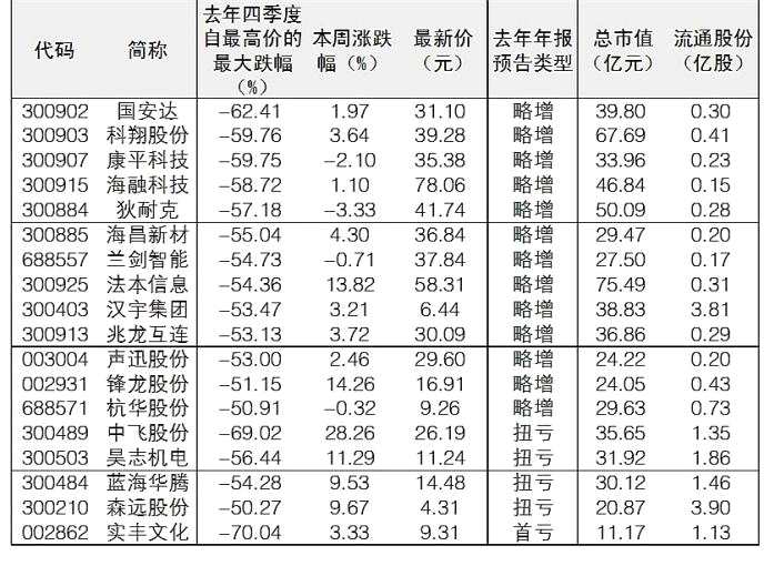 本周以來超跌股表現(xiàn)搶眼,比如正丹股份(行情300641,診股)、日月明(行情300906,診股)、金力泰(行情300225,診股)等周漲幅均超過了30%。據(jù)Wind數(shù)據(jù)統(tǒng)計,去年四季度自最高價的最大跌幅超過50%的個股共計有207只,這其中已經(jīng)預(yù)告去年年報業(yè)績向好的超跌股共計有35只。