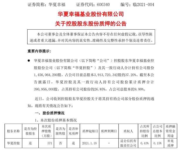 本次質(zhì)押股份數(shù)為571萬股,截止當前華夏控股累計質(zhì)押股份占其持有公司股份數(shù)的26.85%,占公司總股本的9.99%。