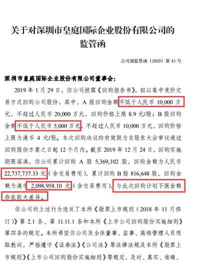 2020年8月21日,深交所向皇庭國際下發(fā)了監(jiān)管函,直指其回購“雷聲大雨點小”,即實際回購遠遠低于其回購計劃。