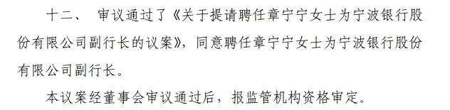 據(jù)寧波銀行發(fā)布公告顯示,章寧寧,女,漢族,1984 年 3 月出生,碩士研究生學(xué)歷。歷任公司金融市場部綜合管理部副經(jīng)理、資金管理部高級經(jīng)理、總經(jīng)理助理、副總經(jīng)理、總經(jīng)理;2019 年 4 月至今任公司資金營運(yùn)中心總經(jīng)理。