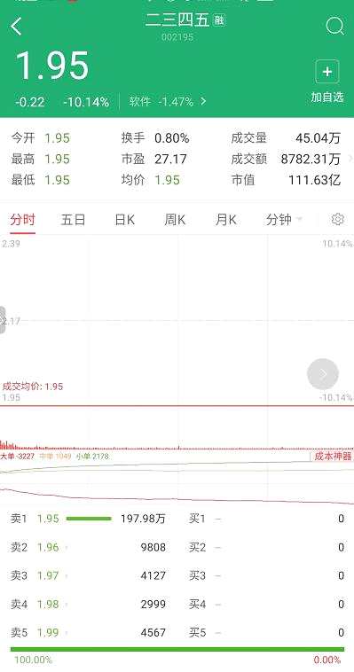 截至今日(1月25日)收盤,公司股價收報1.95元,跌幅達到10.14%,封單超過197.98萬手,總市值為111.63億元。數(shù)據(jù)顯示,截至2020年9月末,二三四五還有26.38萬戶股東。
