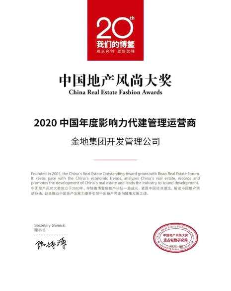 金地管理獲得“2020中國年度影響力代建管理運營商”等品牌榮譽