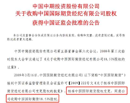 直到2009年3月,中國中期才公告表示,此前收購國際期貨18.53%股份計(jì)劃獲得證監(jiān)會同意。
