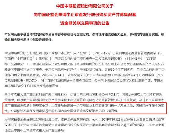到了2019年,中國中期又拋出方案,打算以發(fā)行股份方式收購中期集團(tuán)7名交易對方所持國際期貨70.02%股權(quán),涉資約30.62億元,并向不超過10名符合條件的投資者募集配套資金12億元。不過,此次交易不止引發(fā)市場關(guān)注,更引來了證監(jiān)會、交易所的監(jiān)管函、關(guān)注函。于是,2019年9月,中國中期決定申請中止此次交易。