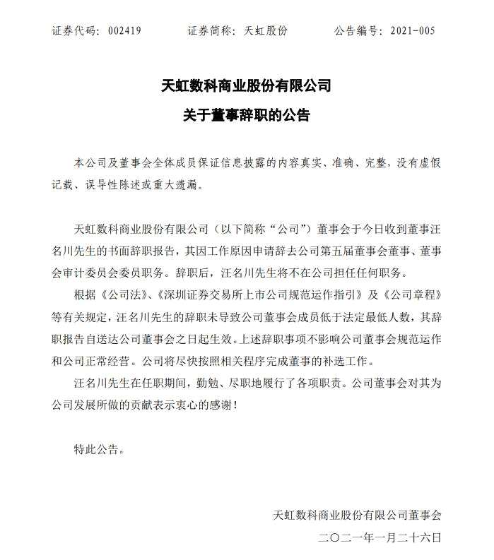摘要: 1月28日消息,《電商報(bào)》獲悉,天虹數(shù)科商業(yè)股份有限公司日前發(fā)布公告稱,公司董事會(huì)于1月26日收到董事汪名川先生的書面辭職報(bào)告,其因工作原因申請辭去公司第五屆董事會(huì)董事、董事會(huì)審計(jì)委員會(huì)委員職務(wù)。