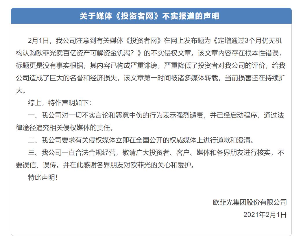 2月1日消息,歐菲光(002456)發(fā)布聲明表示,公司注意到有關(guān)媒體《投資者網(wǎng)》在網(wǎng)上發(fā)布題為《定增通過3個(gè)月仍無機(jī)構(gòu)認(rèn)購 歐菲光賣百億資產(chǎn)可解資金饑渴? 》的不實(shí)侵權(quán)文章。