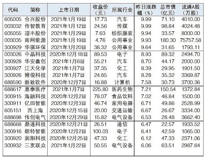 去年12月以來(lái)89只新股上市 39只近端次新股昨日漲幅超6%