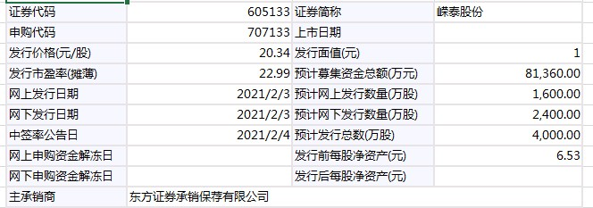 2月3日,同花順(300033)ifind數(shù)據(jù)顯示,嶸泰股份(605133)今日申購(gòu),股票代碼605133,申購(gòu)代碼707133,發(fā)行價(jià)格20.34元/股,發(fā)行市盈率:22.99。