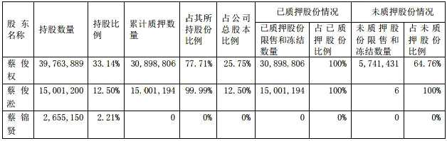 公司控股股東蔡俊權(quán)持有公司股份39,763,889股,累計(jì)質(zhì)押數(shù)量30,898,806,占其所持股份比例為77.71%。蔡俊淞持有公司15,001,200股,累計(jì)質(zhì)押數(shù)量為15,001,194,占其所持股份比例為99.99%,二人合計(jì)質(zhì)押占其所持股份比例為79.94%。
