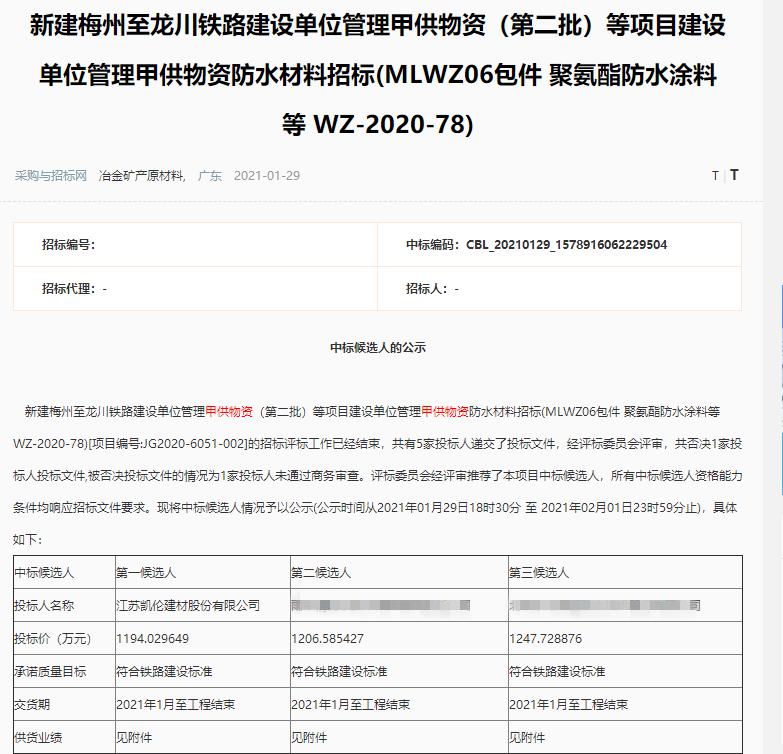 近日,新建梅州至龍川鐵路建設(shè)單位甲供物資(第二批)防水材料招標(biāo)信息已完成公示,凱倫股份(300715)從眾多競標(biāo)單位中脫穎而出,光榮中標(biāo)。