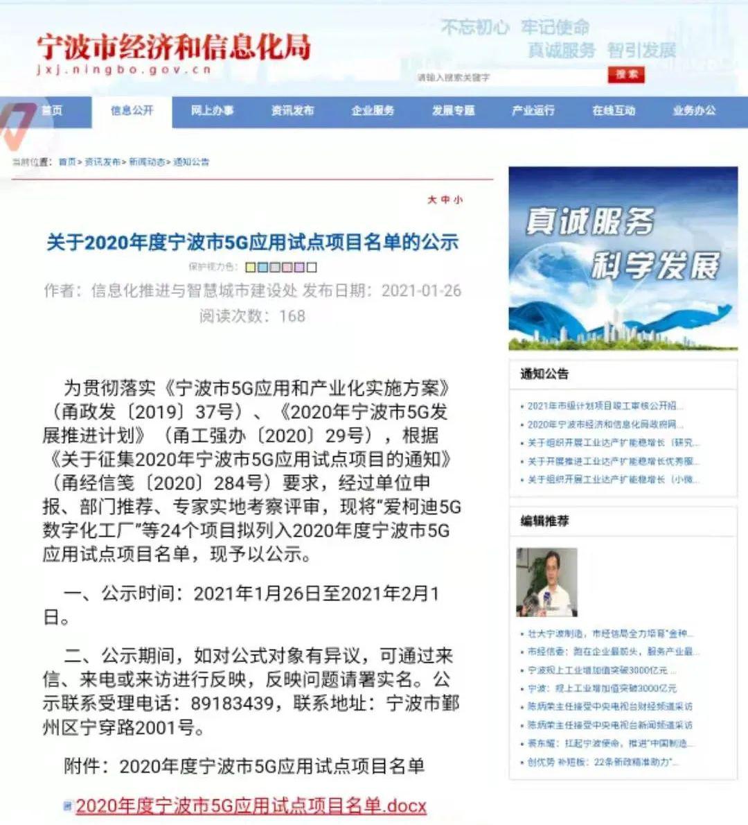 摘要: 根據(jù)《關(guān)于征集2020年寧波市5G應(yīng)用試點(diǎn)項(xiàng)目的通知》(甬經(jīng)信箋[2020]284號(hào))要求,經(jīng)過單位申報(bào)、部門推薦、專家實(shí)地考察評(píng)審,
