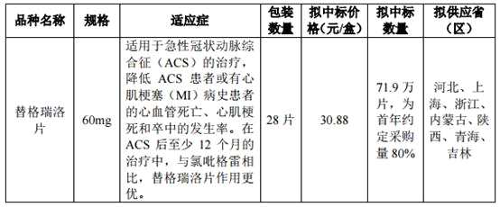 本次替格瑞洛片(規(guī)格:60mg)擬中標(biāo)價(jià)格為30.88元/盒,擬中標(biāo)數(shù)量為71.9萬片,為首年約定采購量的80%,中標(biāo)標(biāo)期為3年。