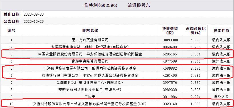 伯特利前十大流通股東中,中國(guó)農(nóng)業(yè)銀行股份有限公司-平安低碳經(jīng)濟(jì)混合型證券投資基金持有528.52萬(wàn)股,持股比例為3.084%,為第3大流通股東;上海彤源投資發(fā)展有限公司-彤源同祥私募證券投資基金持有458.69萬(wàn)股,持股比例為2.676%,為第5大流通股東;交通銀行股份有限公司-平安研究睿選混合型證券投資基金持有426.15萬(wàn)股,持股比例為2.486%,為第6大流通股東;交通銀行股份有限公司-長(zhǎng)城久富核心成長(zhǎng)混合型證券投資基金(LOF)持有332.31萬(wàn)股,持股比例為1.939%,為第10大流通股東。