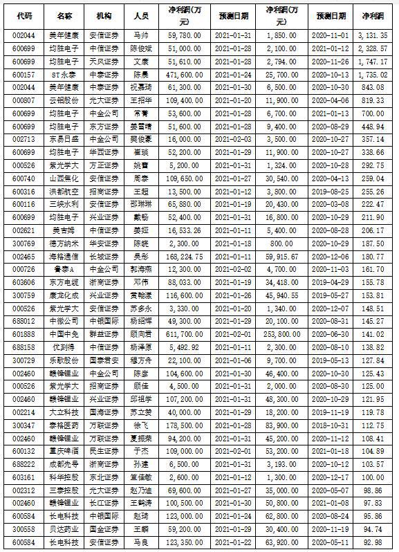 當(dāng)中,美年健康(002044)凈利潤預(yù)測值獲上調(diào)幅度最大。數(shù)據(jù)顯示,安信證券研究員馬帥在去年11月1日發(fā)布的研報中預(yù)測該公司2020年的凈利潤預(yù)測值僅為1850萬元,在今年1月31日發(fā)布的題為《美年健康:公司修正2020年度業(yè)績預(yù)告,四季度業(yè)績略超預(yù)期》的研報中,其將美年健康的凈利潤上調(diào)至59780萬元,上調(diào)幅度高達(dá)3131.35%。