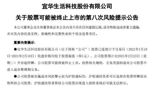 2月10日,【*ST宜生(600978)、股吧】(600978)股價收報于0.61元,成交92.2萬元,目前市值9.05億元。公司今日發(fā)布《關(guān)于股票可能被終止上市的第八次風(fēng)險提示公告》:公司股票已連續(xù)17個交易日(2021年1月19日-2021年2月10日)收盤價格均低于股票面值(即1元),公司股票預(yù)計自2021年2月23日(星期二)開市起停牌,公司股票可能將被終止上市。按照相關(guān)規(guī)則,交易類強制退市公司股票不進入退市整理期交易。