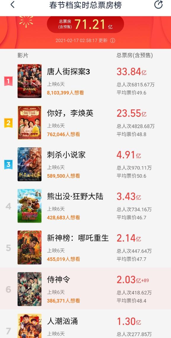 摘要: 搜狐娛樂(lè)訊(哈麥/文)初一到初五,全國(guó)電影總票房達(dá)到了71億元(含預(yù)售),早就刷新了2019年的59億元紀(jì)錄。再加上初六最后一天假期,六天總票房可能突破80億元,較2019年增長(zhǎng)35.6%。
