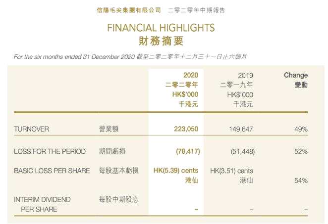 最新財報顯示,2020年全年,“信陽毛尖”實現(xiàn)營業(yè)收入2.23億港幣,同比增長49%,實現(xiàn)凈利潤虧損7841.7萬港幣。