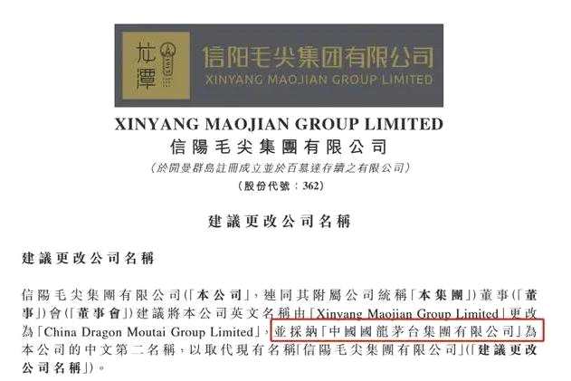 日前, 港股信陽毛尖(00362) 公告,建議將公司英文名稱由“Xin yang Mao jian GroupLimited”更改為“China Dragon Moutai Group Limited”,并采納“中國國龍茅臺集團有限公司”為公司的中文第二名稱,以取代現(xiàn)有名稱“信陽毛尖集團有限公司”。