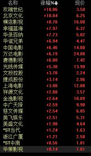 2月18日,春節(jié)過后A股首日開盤,影視板塊大漲,截至發(fā)稿,歡瑞世紀(000892)、北京文化(000802)漲停,橫店影視(603103)漲近9%,幸福藍海(300528)、華錄百納(300291)漲超7%,華誼兄弟(300027)、中國電影(600977)、萬達電影(002739)、唐德影視(300426)漲超6%,光線傳媒(300251)、文投控股(600715)等跟漲。