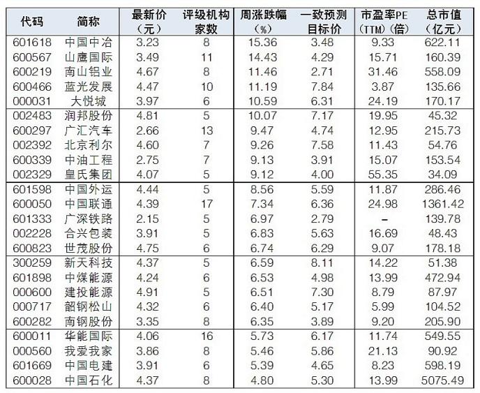 本周低價(jià)股有所表現(xiàn)。根據(jù)昨日收盤價(jià)低于5元,評(píng)級(jí)機(jī)構(gòu)家數(shù)超過4家為標(biāo)準(zhǔn),篩選出48只優(yōu)質(zhì)低價(jià)股,其中中國(guó)中冶(行情601618,診股)、山鷹國(guó)際(行情600567,診股)、南山鋁業(yè)(行情600219,診股)、藍(lán)光發(fā)展(行情600466,診股)、大悅城(行情000031,診股)、潤(rùn)邦股份(行情002483,診股)本周漲幅超過10%。